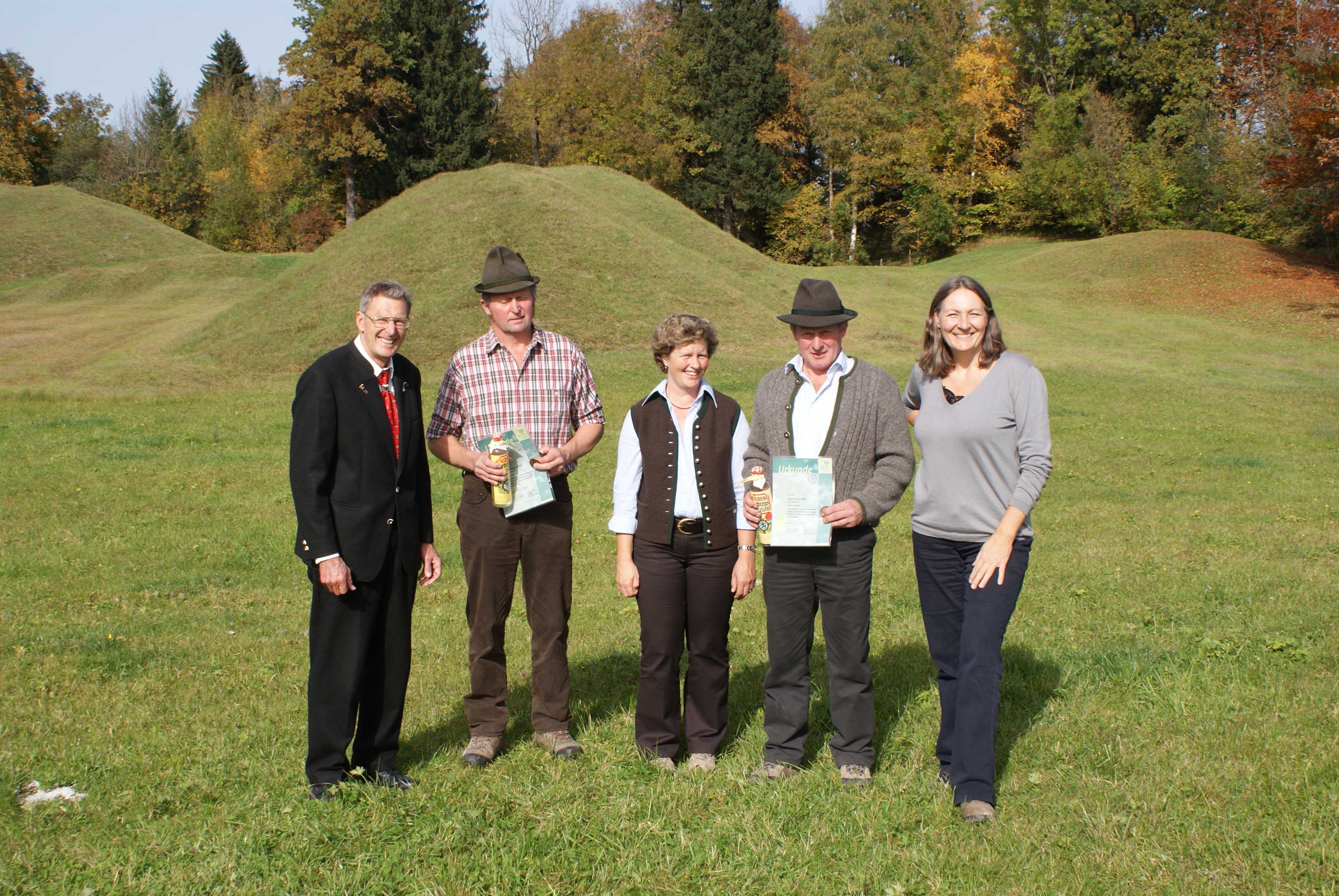Die Ehrung 2008 durch die Kreisgruppen-vorsitzende Frau Belloni (rechts) und Heribert Zintl (links) ging an zwei Landwirte aus Lengries: Anton Heiß (mit Frau) und Johann Heiß, die gemeinsam die Tumulus-Landschaft am Fuße des Bauneck pflegen und dafür sorgen, dass die wertvollen Biotope mit verschiedenen Pflanzengesellschaften erhalten bleiben. Herzlichen Dank dafür!